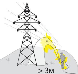 Серьезную опасность представляет собой соприкосновение сплошной струи воды с проводами. Необходимо выдерживать расстояние от проекций ближайшего к трактору провода до сопла дождевальной машины не менее 50-85 м.