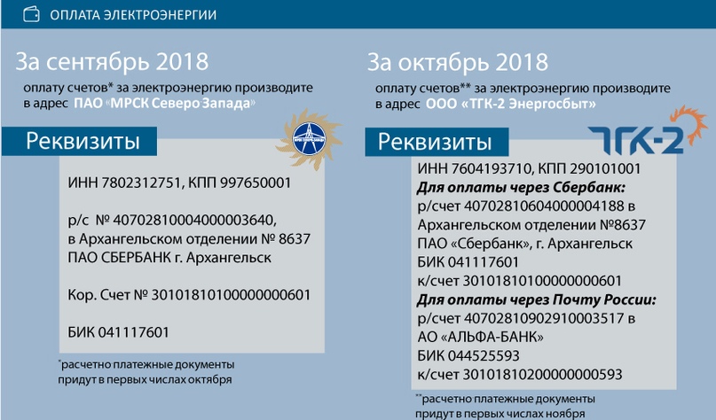 Сумма к оплате, указанная в платёжных документах СЕНТЯБРЯ 2018 года (расчетно-платежные документы придут в первых числах октября) подлежит перечислению в адрес ПАО «МРСК Северо-Запада». Оплату электроэнергии за ОКТЯБРЬ 2018 года (квитанции придут в начале ноября) необходимо будет производить по реквизитам гарантирующего поставщика ООО «ТГК-2 Энергосбыт».